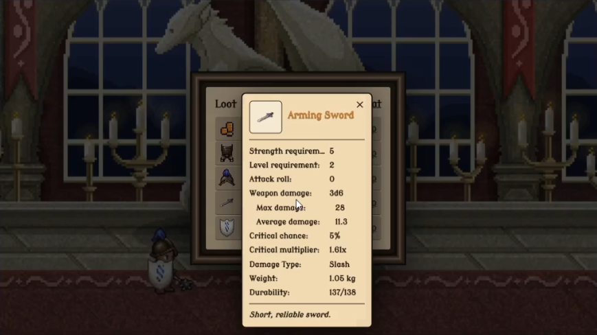 Weapons can deal either bludgeoning, piercing, or slashing damage and have their own damage dice that are rolled upon a successful hit.